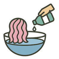 Füllen Sie ein Gefäß mit kaltem Wasser und fügen Sie eine geringe Menge Weichspüler hinzu. Rühren Sie die Mischung gründlich um, bis sie zur Verwendung bereit ist. Der Weichspüler trägt dazu bei, die Fasern geschmeidig zu halten und erleichtert das Kämmen des Haares nach dem Trocknen.